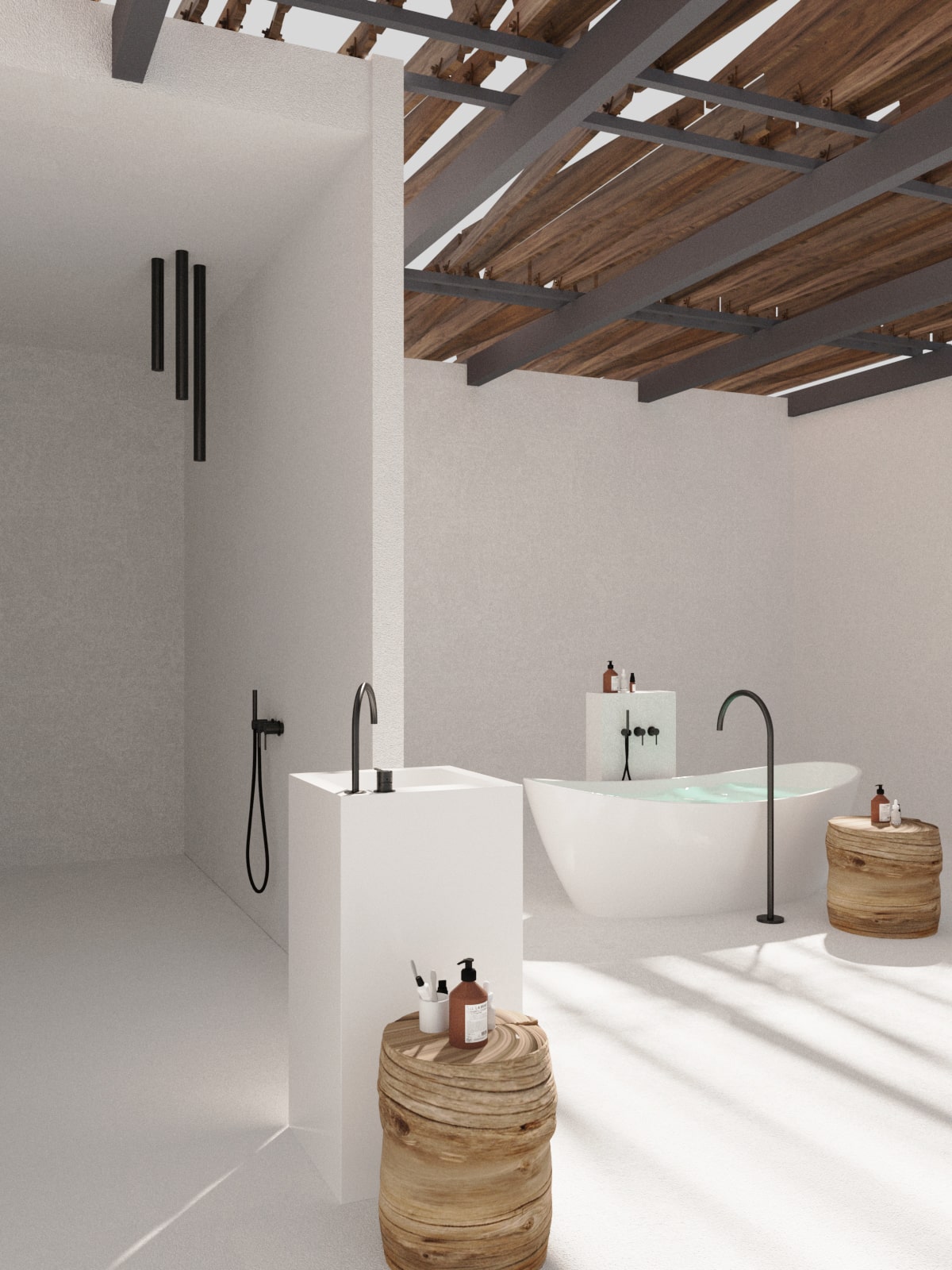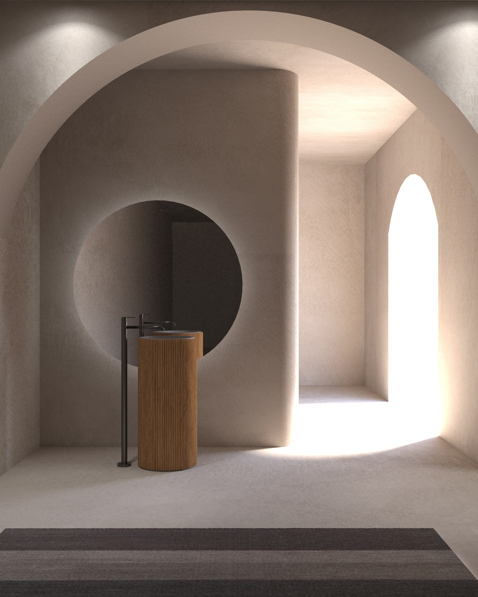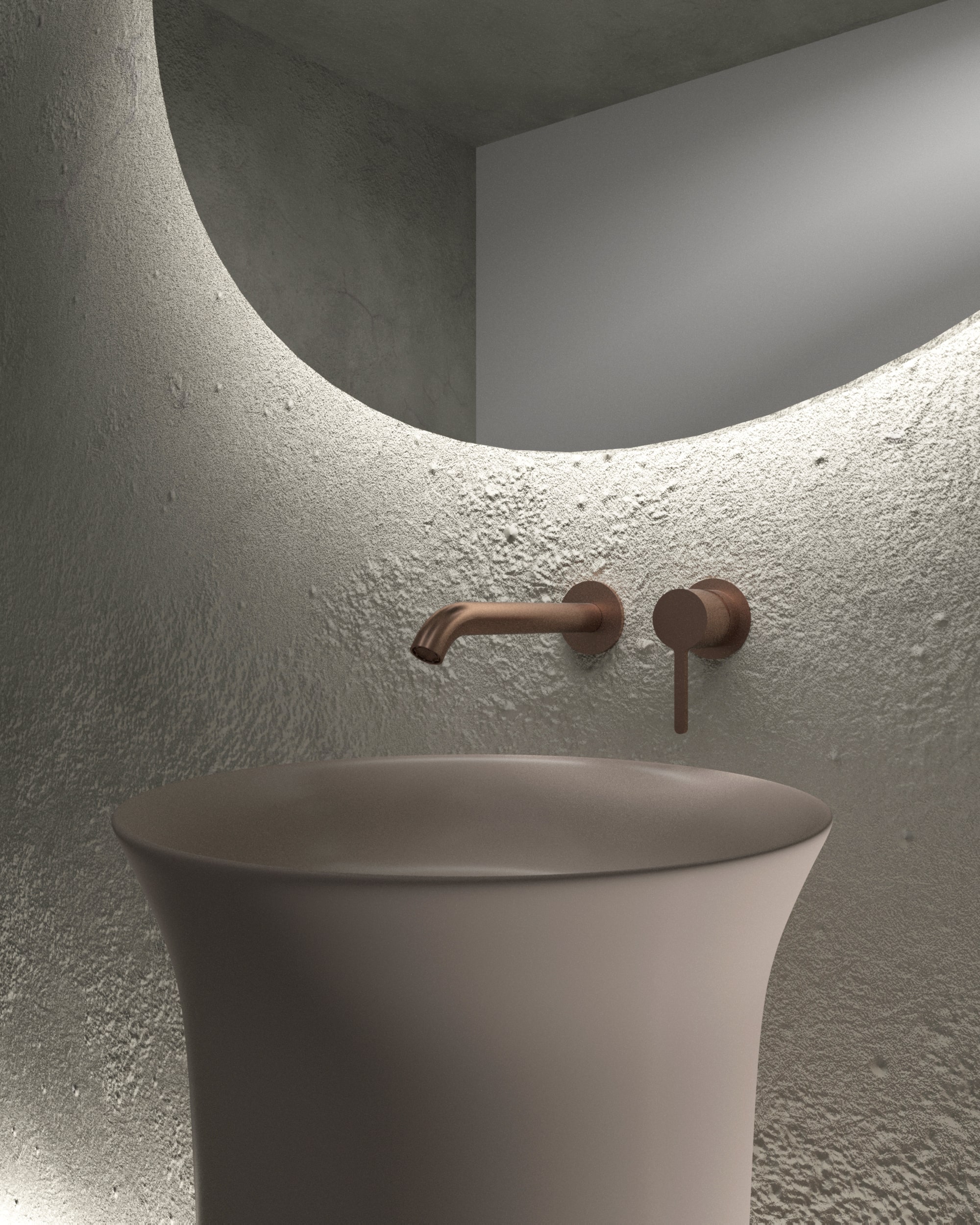 This faucet can be ordered in five colors: matte steel, shiny steel, matte black, matte gold, matte rose gold. This series includes short pedestal and long pedestal washbasins, built-in washbasins, standing washbasins, built-in toilets, built-in baths, standing bathtubs and rimmed bathtubs.