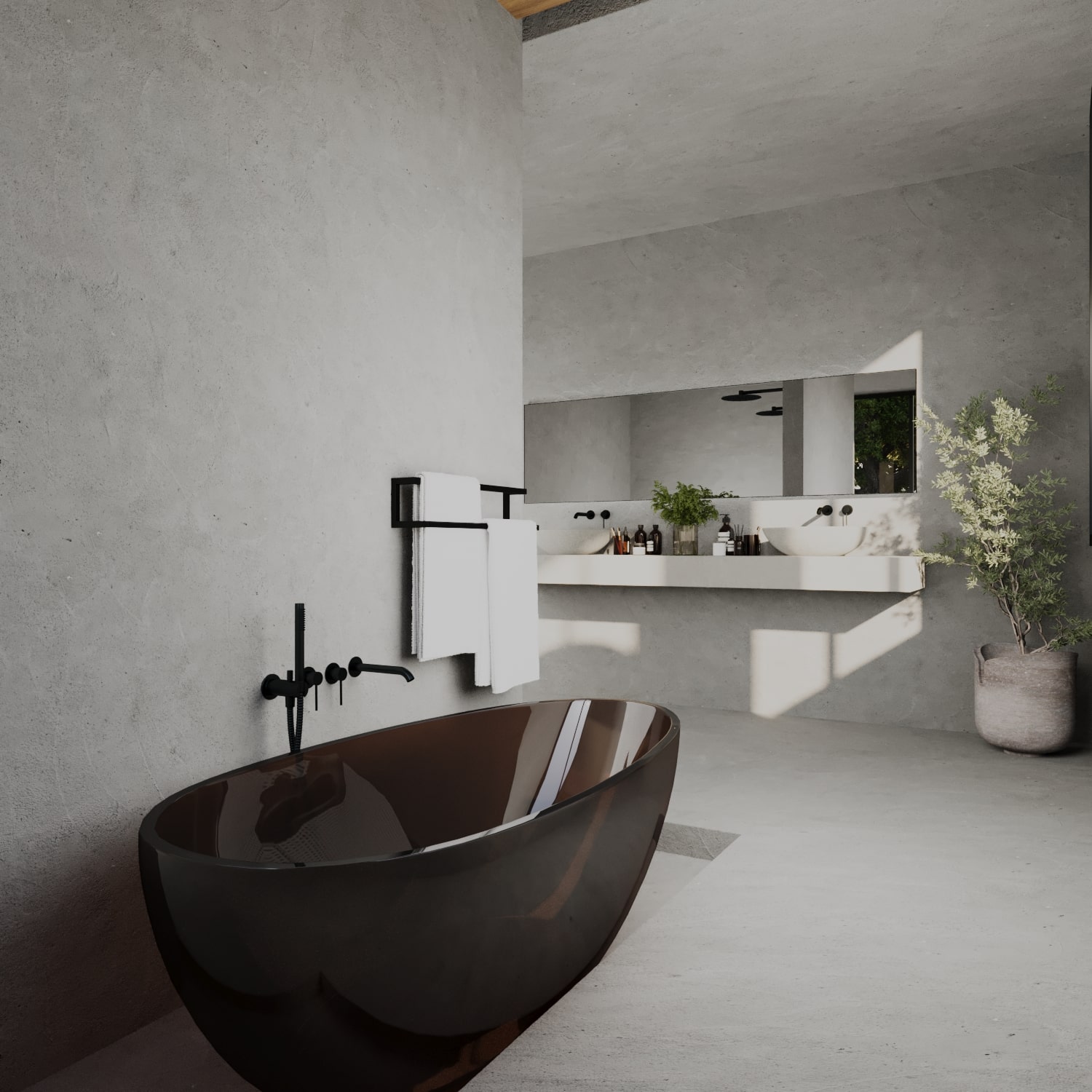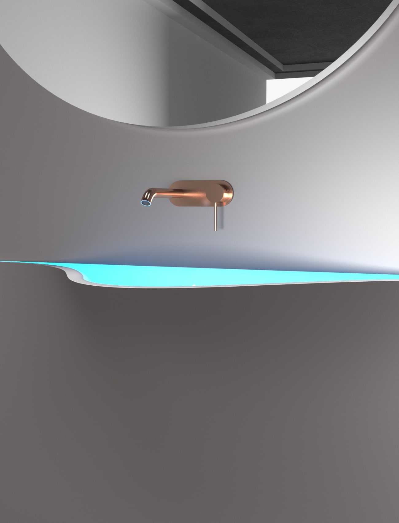The circular surface of this faucet is polished by CNC lathe. In the design of this faucet, the light reflection on its handle is reminiscent of a gramophone record. The Nova series can be ordered with four different tread models. This faucet can be ordered in five colors: matte steel, shiny steel, matte black, matte gold, matte rose gold. This series includes short pedestal and long pedestal washbasins, built-in washbasins, standing washbasins, built-in toilets, built-in baths, standing bathtubs and rimmed bathtubs.