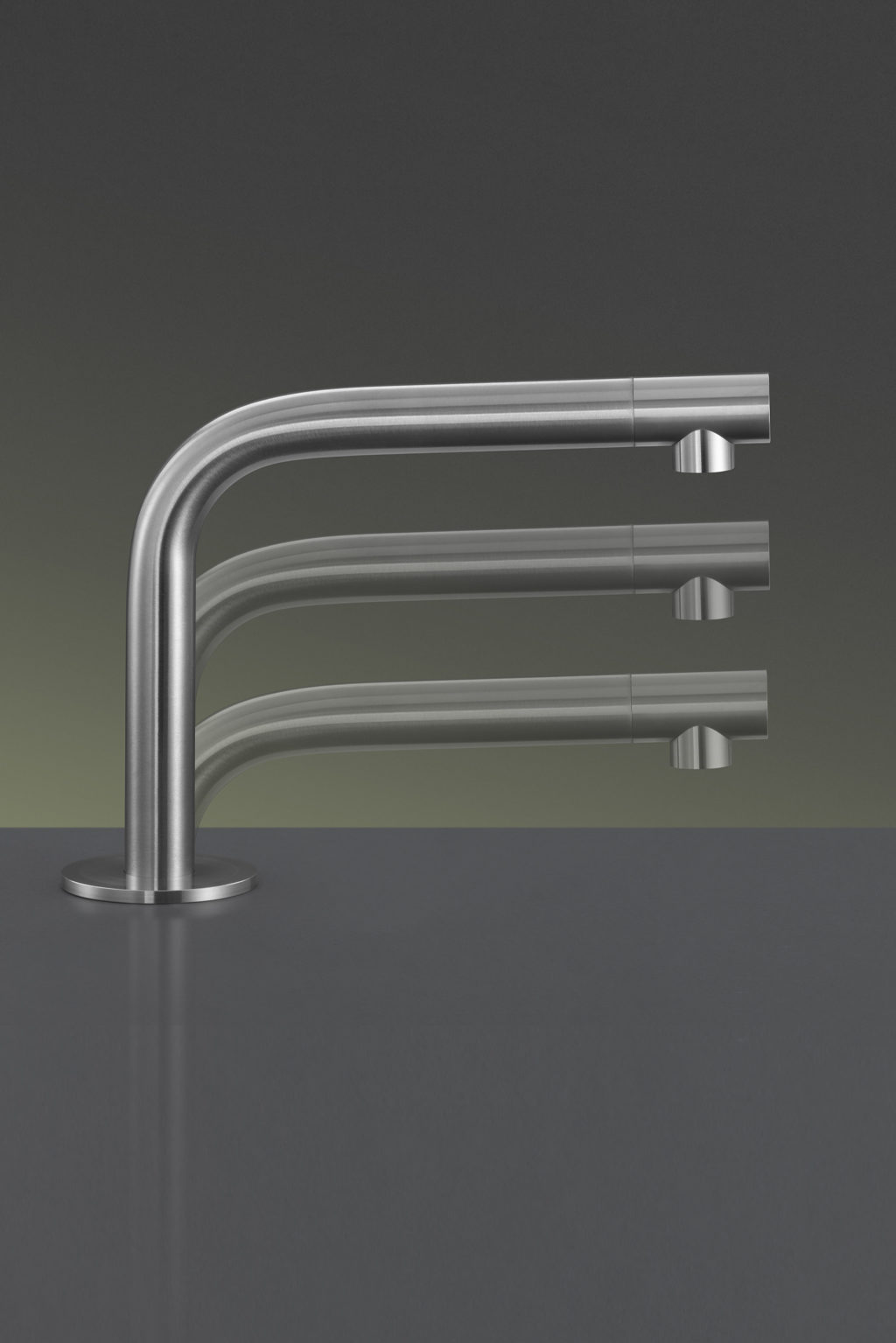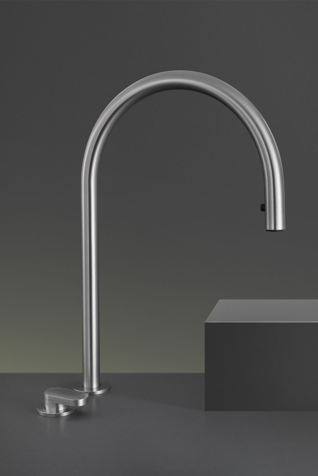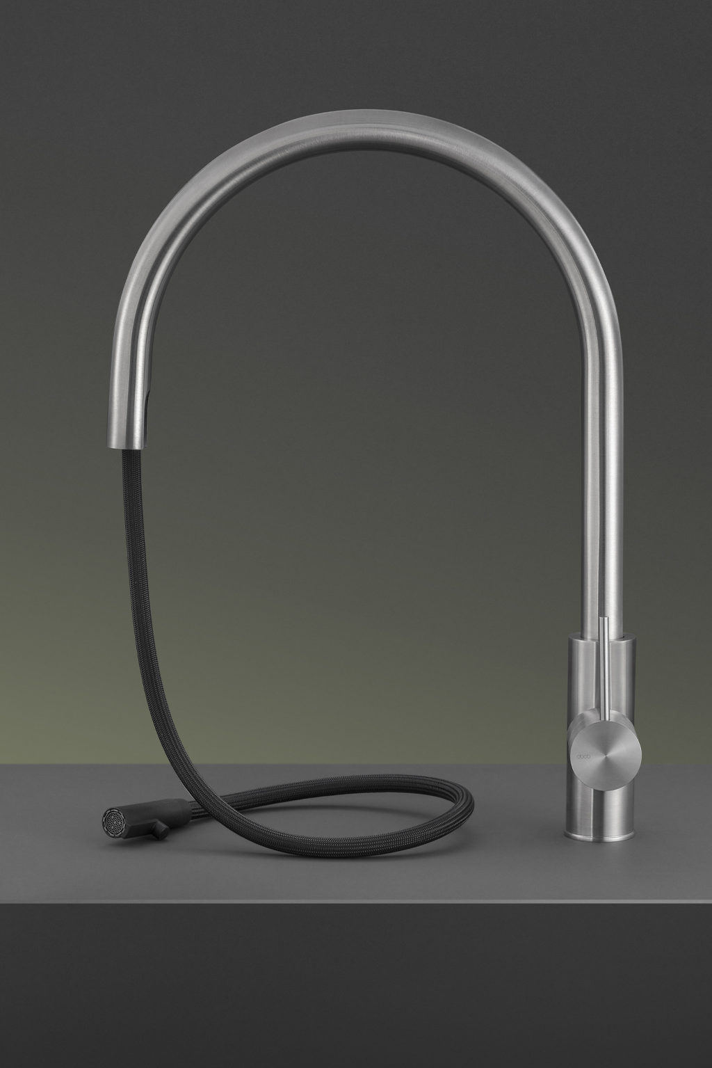 This faucet can be ordered in five colors: matte steel, shiny steel, matte black, matte gold, matte rose gold.